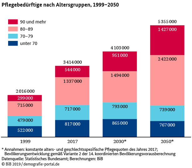 Zwischen 1999 und 2017 ist die Zahl pflegebedürftigwe Personen ind Deutschland um 1,4 Millionen gestiegen und wird vorraussichtlich bis 2050 um weitere 1,2 Millionen zunehmen.
